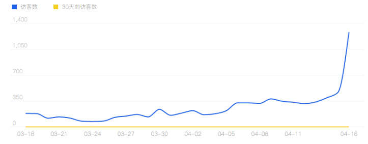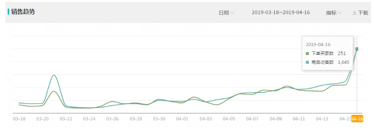 30天数据,一直在稳步提到,4.16号得到爆发,当天下单买家数251,商品访客数1645