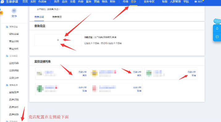然后你在竞争-竞店配置里面添加你在前面筛选出来的店铺进行分析,看和你的交易对比,是不是你的核心竞店,是不是你可以去作为目标超越的对手。